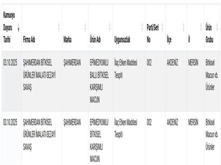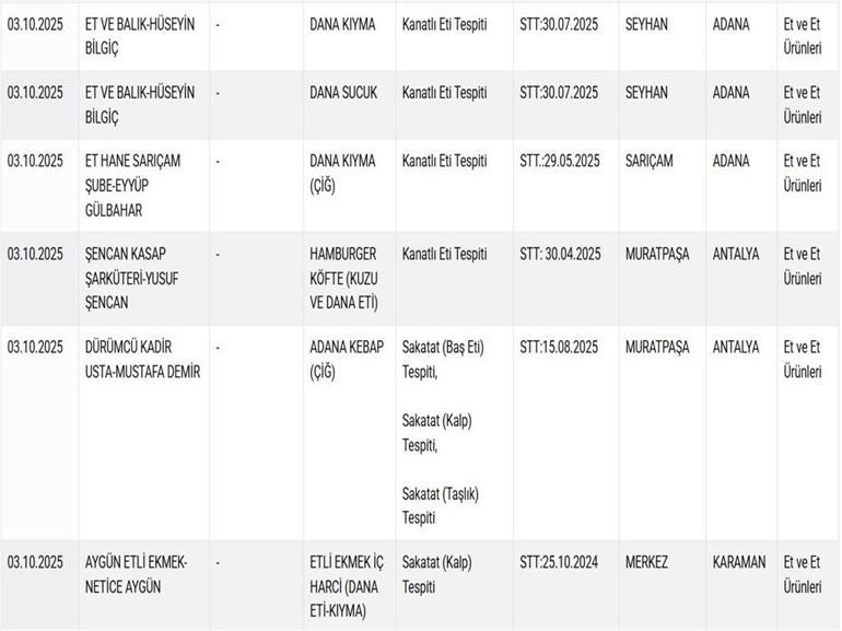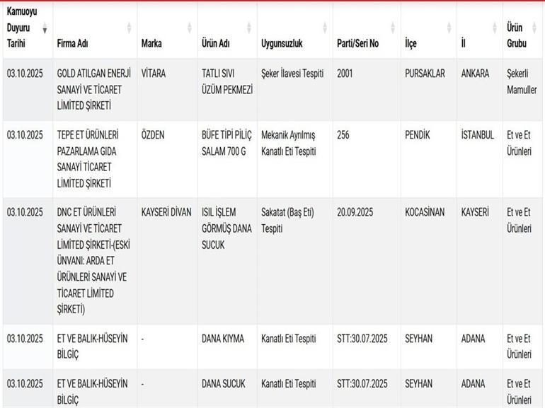 Yeni güncellenen listede, sağlığı tehlikeye düşürebilecek 2 ürün olmak üzere toplamda 22 yeni ürün daha yer aldı. Listede zeytinyağı, bal, kıyma, sucuk gibi ürünlerin yanı sıra pekmez ürünlerinde şeker ilavesi ve bazı markaların kanatlı etini ‘dana kıyma’ olarak sattığı tespit edildi. Ayrıca bir bitkisel ürün markasının ballı bitkisel karışımlı macununda ilaç etken maddesi bulunduğu belirlendi.